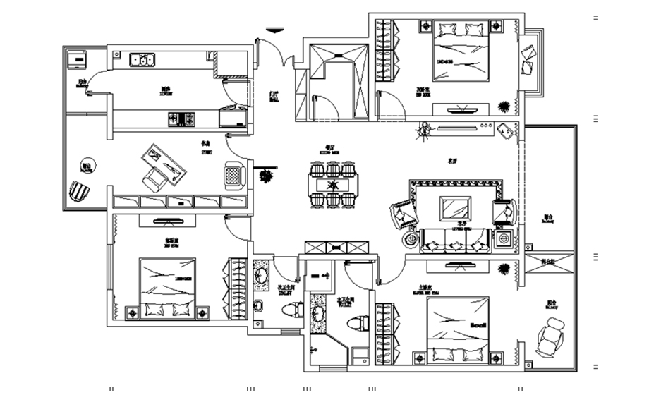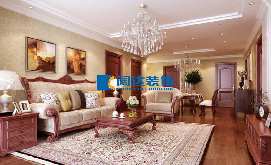 整套房屋的風格為美式簡約,居室色彩主調為溫和色。家具為古典彎腿式,家具、門、窗漆成白色。擅用各種花飾、豐富的木線變化、富麗的窗簾帷幄是西式傳統室內裝飾的固定模式,空間環境多表現出華美、富麗、浪漫的氣氛。客廳:電視背景墻做一個簡約的線條造型,后期搭配上軟裝配飾,空間更加舒適溫馨。