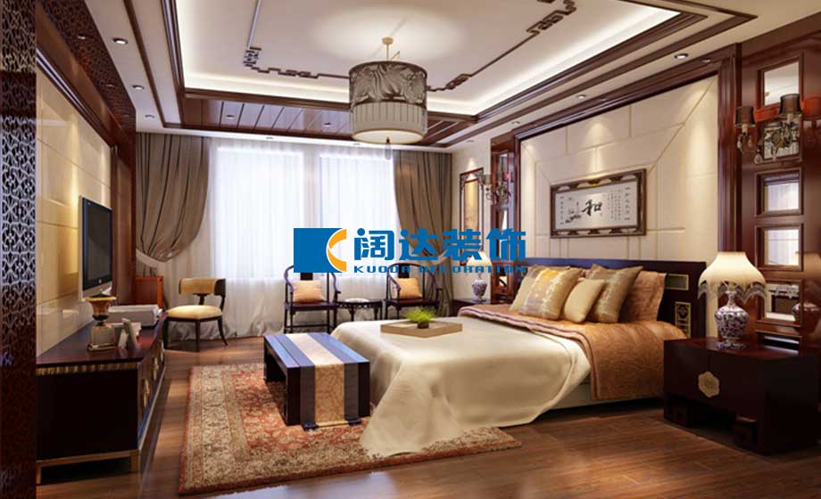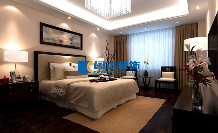 主臥室:本案的主臥室傳承了新中式的風(fēng)格,中式的吊頂和造型床頭背景使的臥室空間充實著中國文化氛圍。