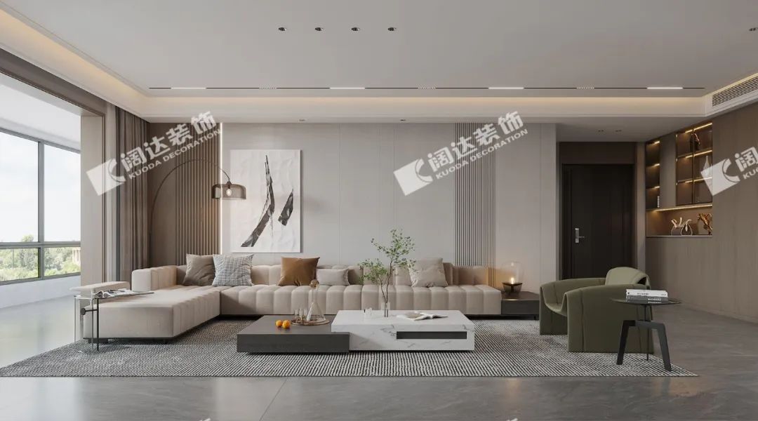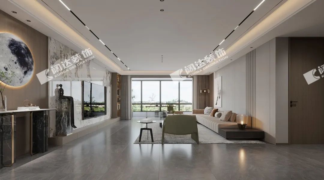 本案通過巖板、墻板、定制電視柜、定制酒柜的設計,頂面采用無主燈線性軌道燈設計,墻頂地多維空間,雖然簡潔,但收納功能強大,且最大程度減少后期打掃衛生的繁瑣性。多種材質和諧地融為一體,滿足了不同年代人們共同的審美需求。空間開闊、舒適,呈現質感的雅奢風范。