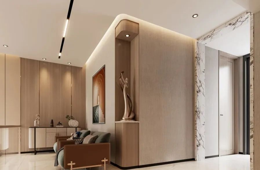客廳:溫暖明亮,經(jīng)濟(jì)耐看是本案的主要需求之一,剔除了法式復(fù)雜的線形后,融入了現(xiàn)代溫暖明亮的暖色系風(fēng)格,材質(zhì)上搭配巖板,給予了視覺(jué)上的沖擊力,成為業(yè)主期待的理想之家。