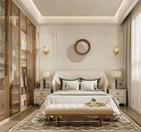 主人房:亞麻色的墻面因?yàn)槭嗑€的加入增加了不少立體度,搭配低飽和度顏色,也能打造出不一樣的視覺(jué)感受,適度加一點(diǎn)角花裝飾,提升層次感的同時(shí),盡顯優(yōu)雅。